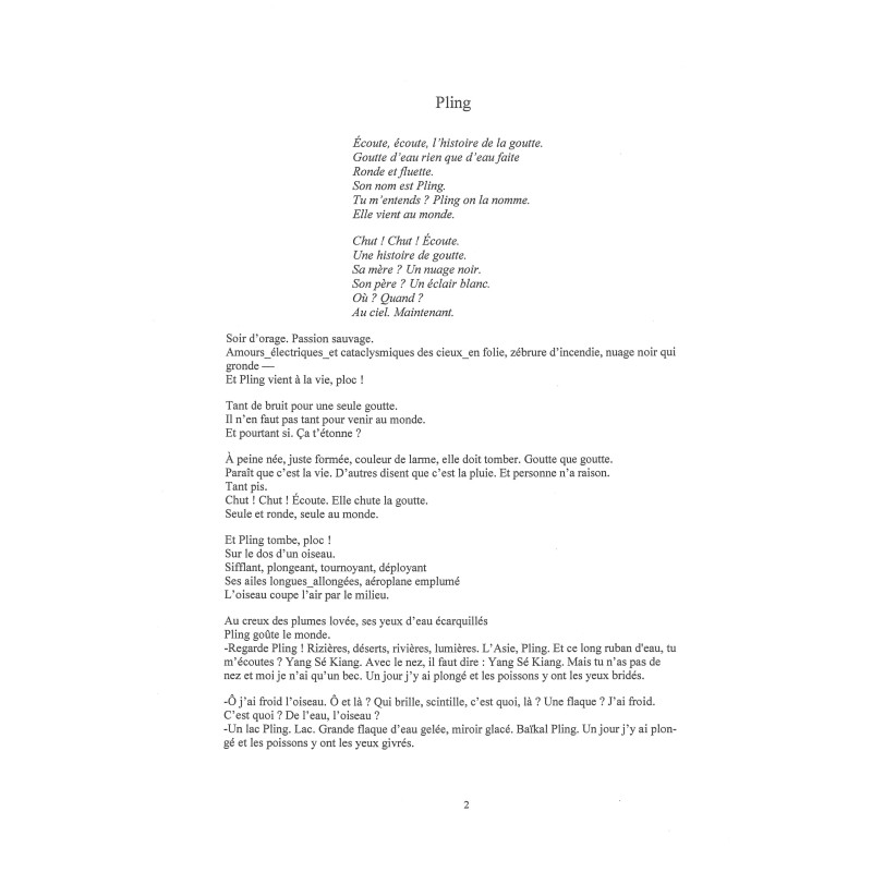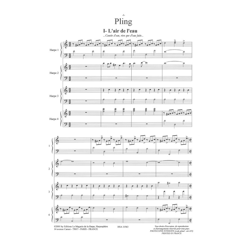 Commande de l'Ecole de musique de Rungis pour la classe de harpe de Laurence Bancaud, Pling fut créé le dimanche 19 mars 2000 par quatorze jeunes interprètes : douze harpistes, un flûtiste et un récitant.