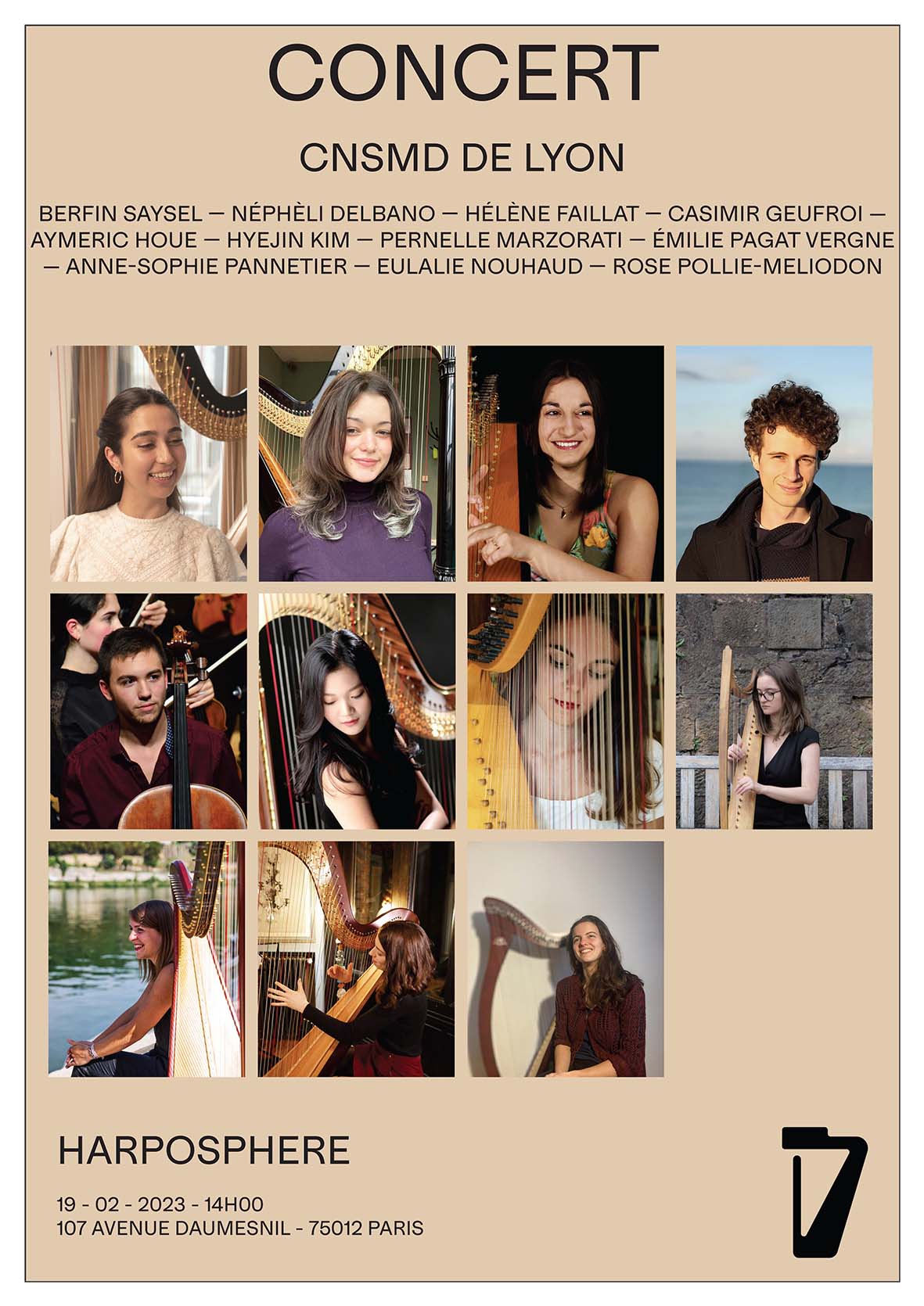 10 Étudiants des classes de harpe moderne et anciennes du CNSMDL, avec la participation de trois autres étudiants du CNSMDL.