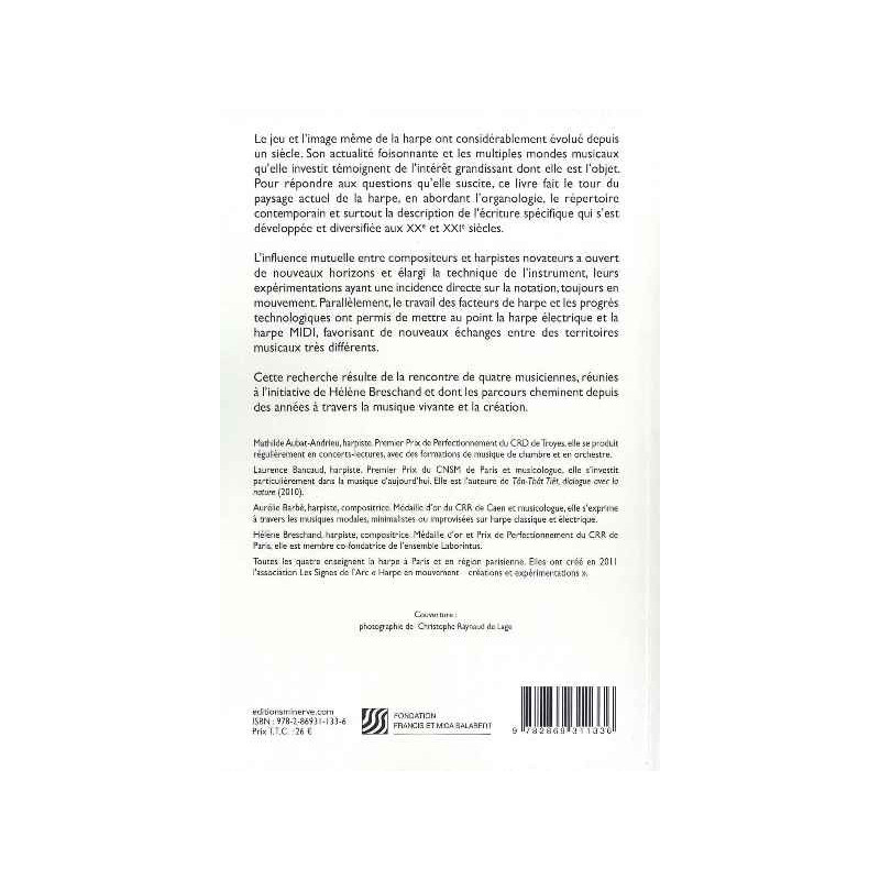 Le jeu et l’image même de la harpe ont considérablement évolué depuis un siècle. Son actualité foisonnante et les multiples mondes musicaux qu’elle investit témoignent de l’intérêt grandissant dont elle est l’objet. Pour répondre aux questions qu’elle suscite, ce livre fait le tour du paysage actuel de la harpe, en abordant l’organologie, le répertoire contemporain et surtout la description de l’écriture spécifique qui s’est développée et diversifiée aux XXe et XXIe siècles.