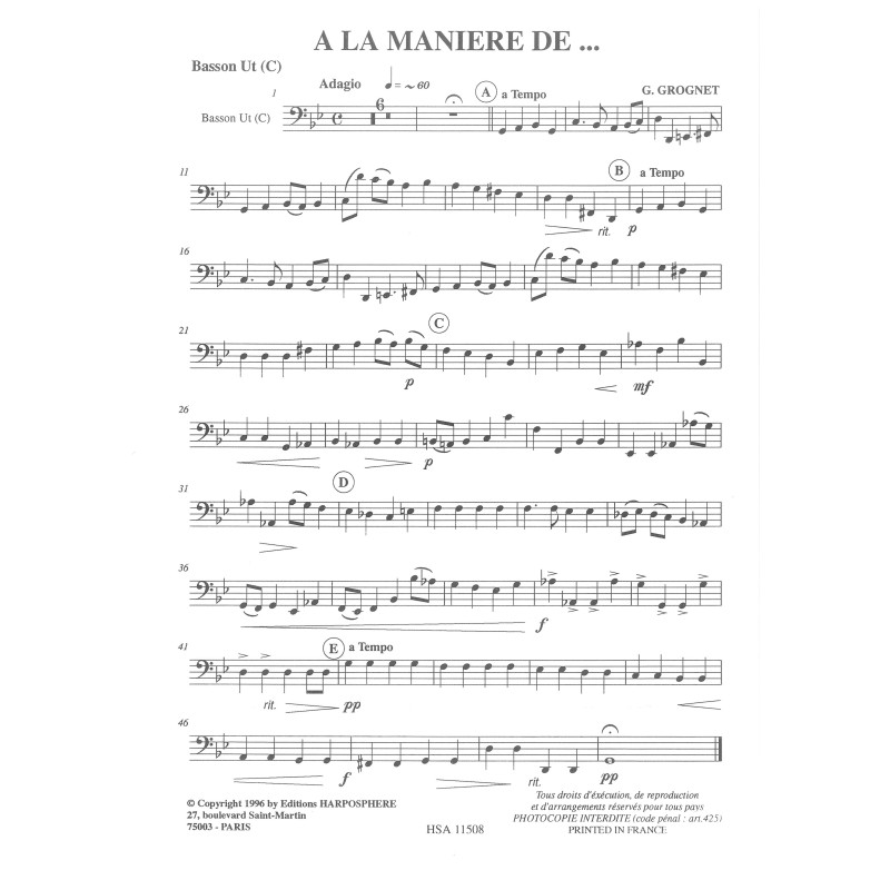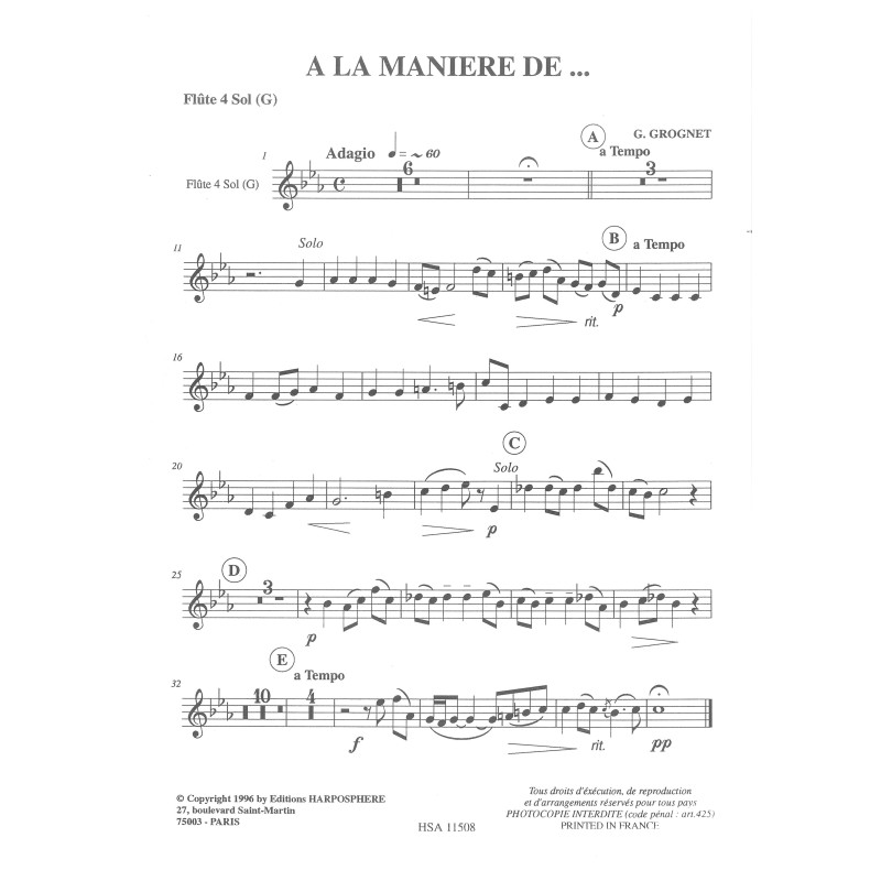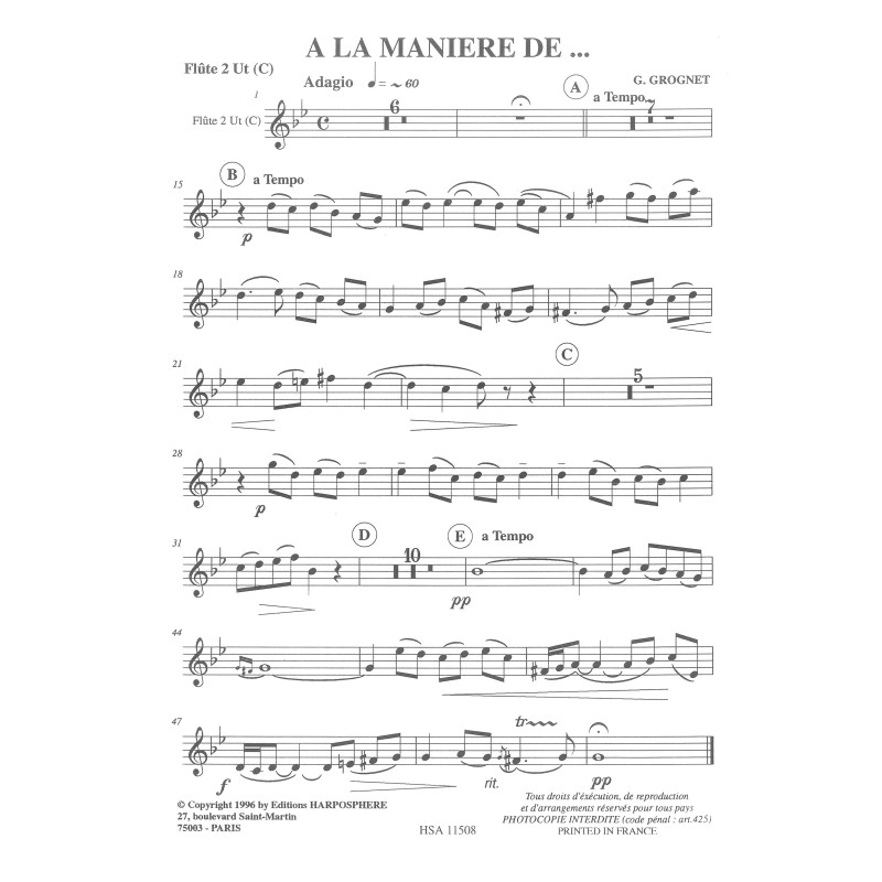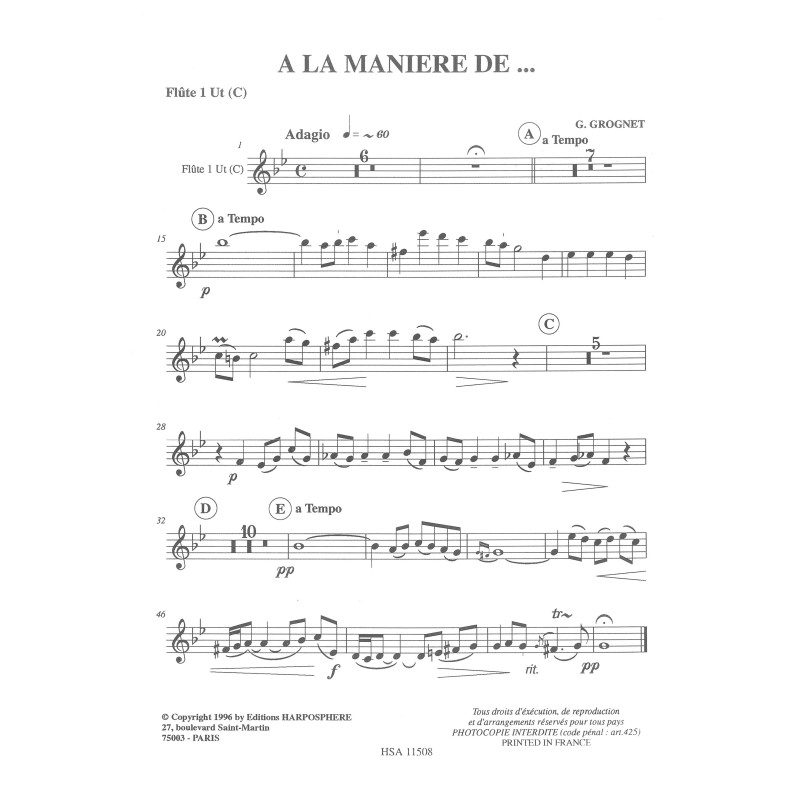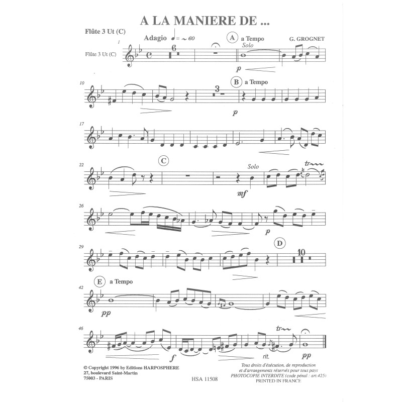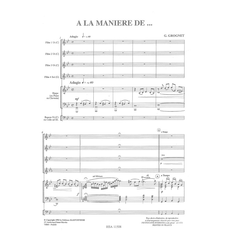 Formation : Pour trois flûtes en ut, une flûte en sol, harpe (ou piano ou clavecin) et basson en ut (ou violoncelle ad lib.)