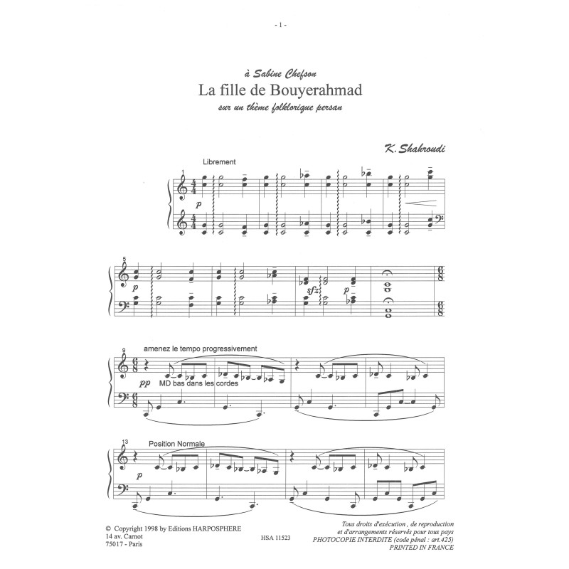 La fille de Bouyerahmad pour harpe celtique est le fruit d'une collaboration avec Sabine Chefson. Cette œuvre cherche à faire revivre dans le répertoire de la musique persane moderne un instrument qui en Iran, a disparu peu à peu, mais dont on garde les traces au fil du temps dans la poésie persane ancienne.