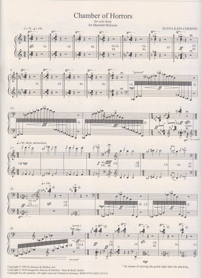Ein Stück in einem Satz, mit 13 Akkorden, die in siebener und sechser Gruppen aufgeteilt sind. Das Stück wird beherrscht durch eine Art spielereichen Gruselharmonien, die ich durch verschieden Stadien entwickelte, um den Farbenreichtum der Harfe auszuloten.“ (Elena Kats-Chernin)